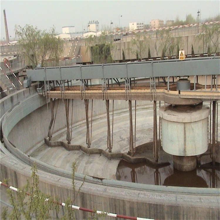 沉淀池污水經(jīng)工作橋下的進(jìn)水管流入導(dǎo)流筒,在導(dǎo)流筒傘形罩的均勻分配下,呈擴(kuò)散狀流向池周,污泥依靠自重沉降于池底,刮板在刮臂的帶動(dòng)下緩慢旋轉(zhuǎn),經(jīng)分離后的上清液通過出水堰板排出池外,沉淀后的污泥由刮板沿池周刮向中心集泥坑,依靠液體靜壓作用經(jīng)排泥管排至池外。